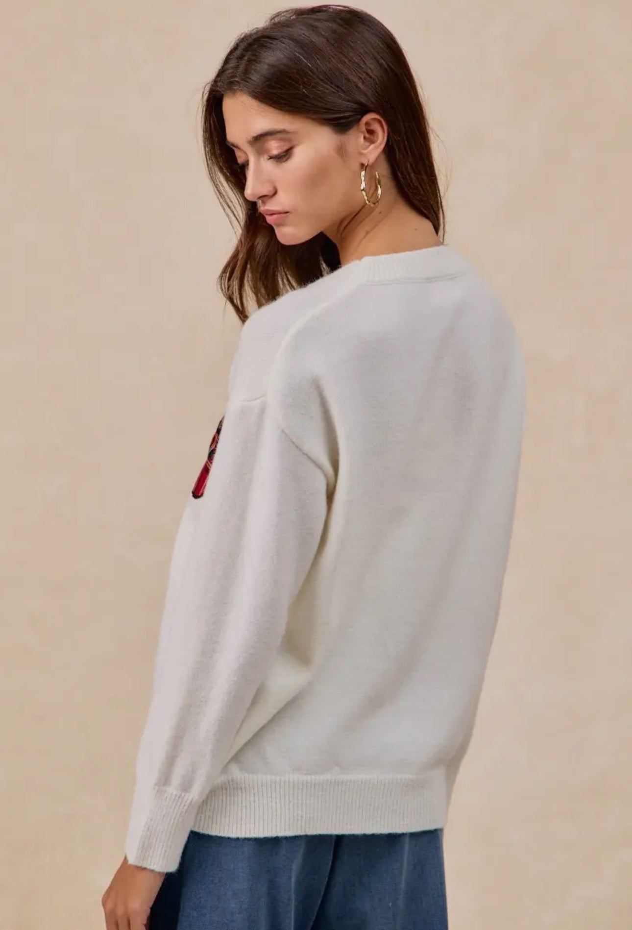 With its relaxed fit, ribbed edges, and timeless ivory base, it’s an easy choice for everything from holiday parties to cozy nights by the tree. Pair it with our Tartan Plaid Palazzo Pants, jeans, or plaid skirts for a picture-perfect seasonal look.